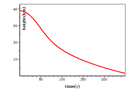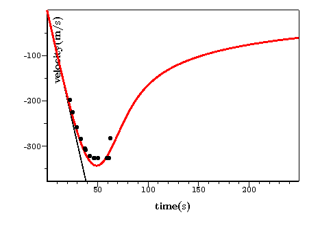 | Height of a solid ball of 128 cm diameter and 120 kg mass as a function of the time at intervals of 1 second. | Velocity of a solid ball of 128 cm diameter and 120 kg mass as a function of the time at intervals of 1 second and actual data (dots). |