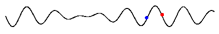 Let us first discuss the sinus part of the full disturbance. It contains 11.5×t which describes the fast oscillation with a period given by which is the average period of each of the two individual disturbances. You may verify that period by stopping the video (with the escape key). The length of the image equals 400 pt, whereas the speed of waves equals 100 pt/s. This implies that the length of the image represents 4 s. We count almost 8 cycles in the stopped image which corresponds thus to a bit more than 0.5 s per cycle. The sinus also contains 0.115×x. From this we may find the wavelength of the fast oscillation Indeed, almost 8 cycles in the 400 pt length of the stopped image imply a wavelength of a bit more than 50 pt. |