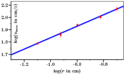 | The logarithm to base 10 of the terminal velocities in water vterm in cm/s versus the logarithm to base 10 of the radius r in cm of five metal bearing balls, different in size but with the same density. Data are taken from J.P. Owen and W.S. Ryu, Eur. J. Phys. 26, 1085 (2005). The straight line fit to the data is given by log(vterm) = 2.3 + 0.46log(r). |