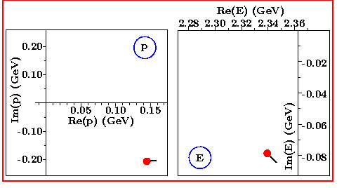 E = sqrt( p2+mD2 ) + sqrt( p2+mK2 ) We vary continuously the model's coupling constant from a small (0.60) towards a large value (1.2). In the complex-momentum (p) plane we observe that the pole turns purely imaginary somewhere in the lower half-plane. This is typical for S-wave scattering. For any higher angular momentum this happens at p=0. The scattering-matrix singularity represents a bound-state pole when it lies on the positive imaginary axis. On the negative imaginary axis it represents a virtual bound state. |
